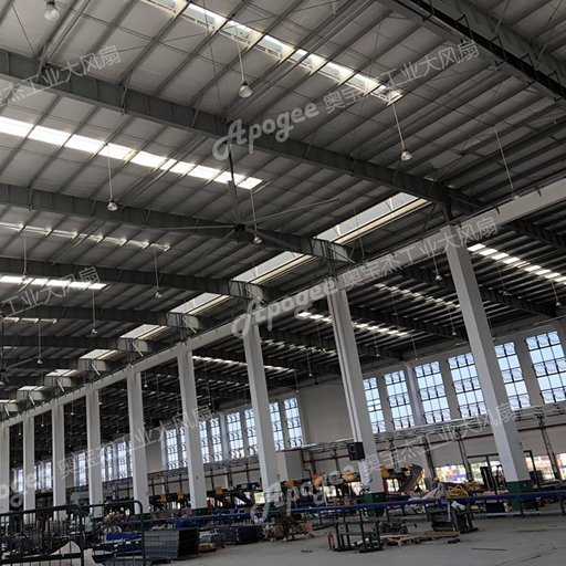 示例圖為湖南一家國(guó)有企業(yè)生產(chǎn)機(jī)電零部件車間,典型的鋼結(jié)構(gòu)建筑。長(zhǎng)度150米, 寬度72米面積10800平米共三跨。 屋面離地高度15米,在沒有吊扇改造前,工廠采用98臺(tái)工業(yè)小風(fēng)扇(強(qiáng)力風(fēng)扇,牛角扇)改善員工工作環(huán)境。 然而高溫季節(jié),環(huán)境溫度34-39度時(shí), 部分小風(fēng)扇應(yīng)用覆蓋距離和面積有限, 部分員工近距離靠著小風(fēng)扇長(zhǎng)時(shí)間強(qiáng)風(fēng)環(huán)境下產(chǎn)生不適反應(yīng),原有的通風(fēng)降溫不能解決問題, 另外隨著工廠安全管理需要小風(fēng)扇由于電纜和潛在靠近旋轉(zhuǎn)扇葉的風(fēng)險(xiǎn)也不適應(yīng)工廠未來發(fā)展工廠需要有一個(gè)性價(jià)比高的通風(fēng)降溫解決方案, 根據(jù)工廠要求, 奧寶杰實(shí)地了解原有車間環(huán)境, 從廠房面積, 高度, 設(shè)備人員布局的整體考慮,優(yōu)化吊扇布局和氣流, 使用了18臺(tái)奧寶杰(Apogee) TM-7300 (直徑7.3米)進(jìn)行環(huán)境改善。