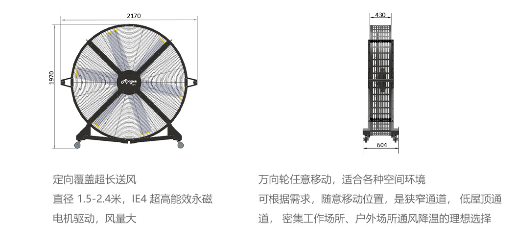 MDM采用永磁無(wú)刷電機(jī)直接驅(qū)動(dòng), 電機(jī)高效節(jié)能, 超高可靠性,扇葉采用高強(qiáng)度鋁鎂合金,流線結(jié)構(gòu)扇葉大化風(fēng)量及風(fēng)扇覆蓋距離, 相比低成本鈑金扇葉, 流線結(jié)構(gòu)扇葉有更好出風(fēng)效率,氣流平穩(wěn)性,靜音效果。 產(chǎn)品適合室內(nèi),室外使用, 方便實(shí)用